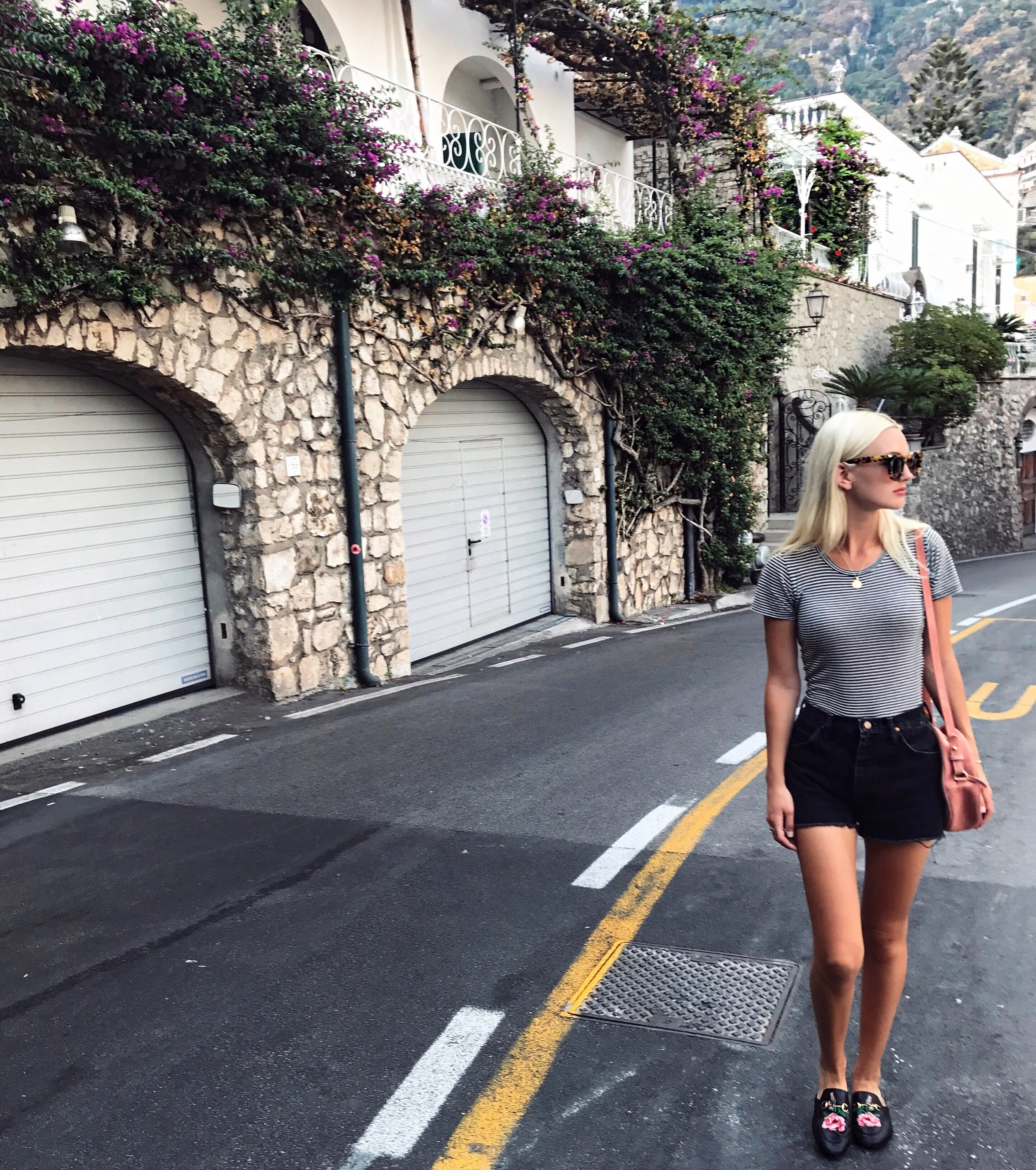 WALKING THE STREETS OF POSITANO WEARING REFORMATION TEE, PALMA BAG, GUCCI LOAFERS & WRANGLE SHORTS